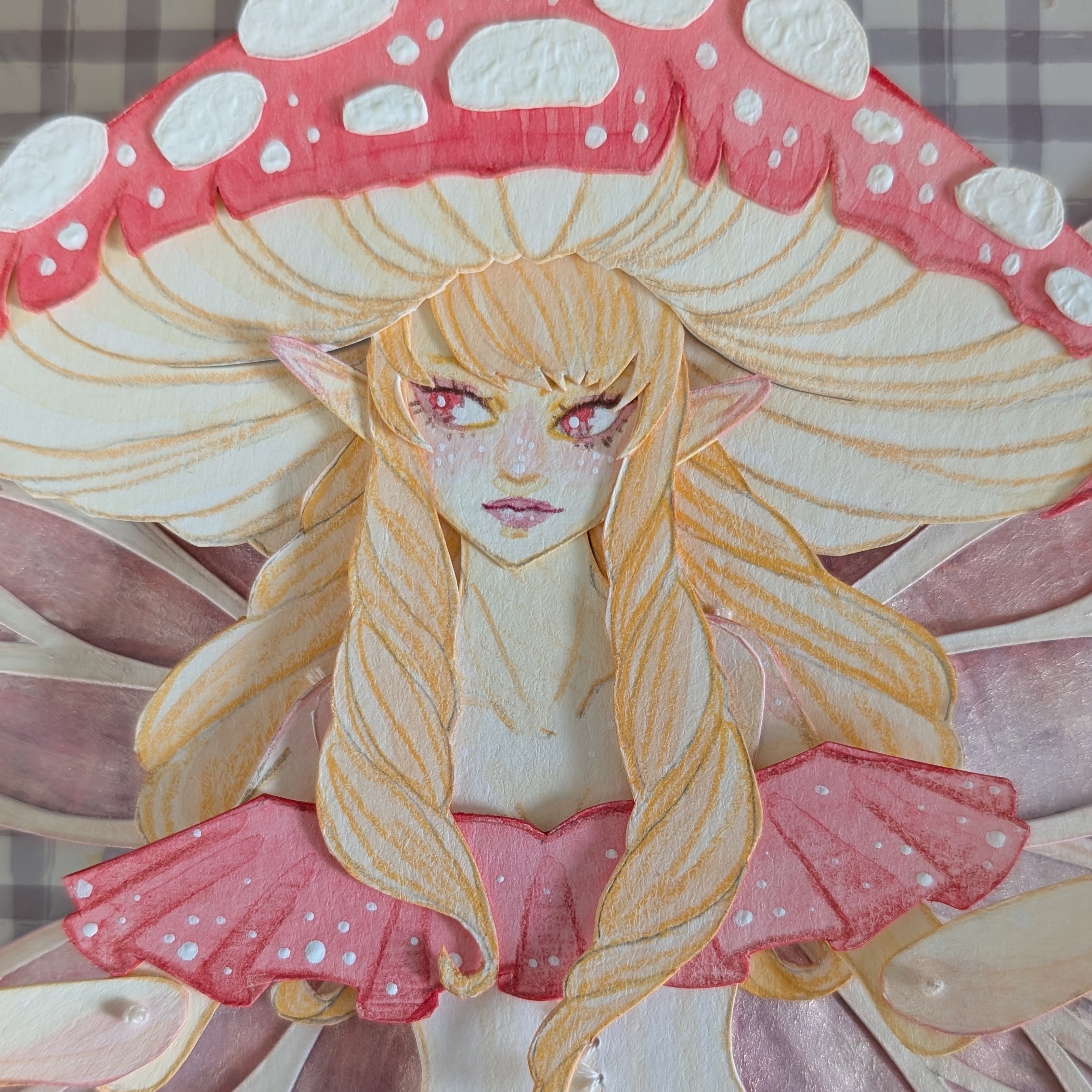The reason I chose the easy option that day is because I was also working on MUSHROOM FAIRY as a paper art doll. I was so excited for this prompt since I had decided to try something new. I never made a paper doll before, with poseable arms and legs, so figuring that out was so much fun. The process wasn’t too far from my usual, just a small change to how and when the pieces came together. Since I didn’t need to think about a background, I found myself really enjoying the process.