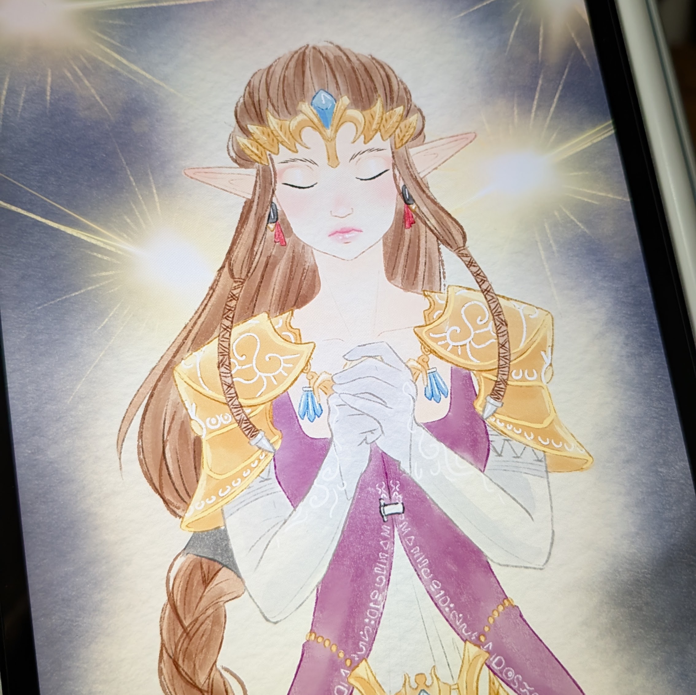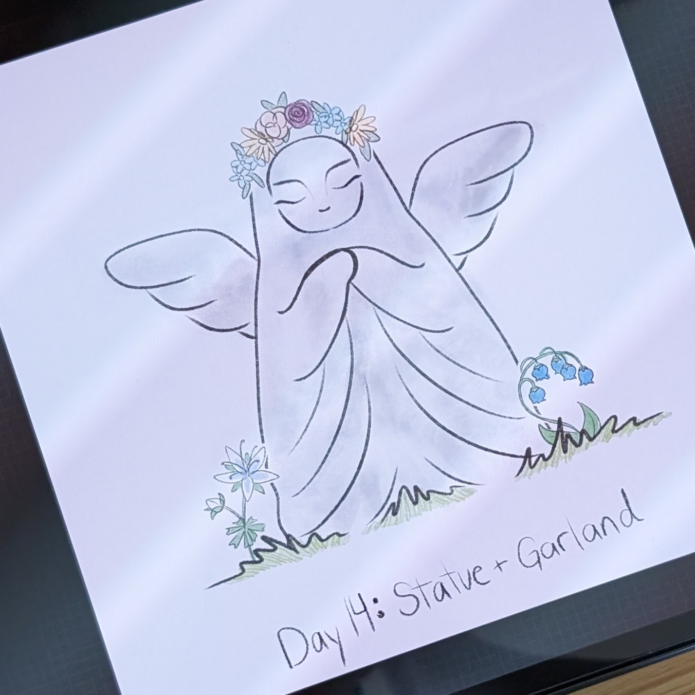 Honestly, TRUNK wasn’t doing anything for me. Sure, I have ideas in mind for it, but I had zero desire to draw any of them. STATUE, on the other hand, was easy. The other option was GARLAND, so I decided I would combine the prompts and do one simple illustration. The result was the Goddess Statue from BOTW/TOTK with a garland around her head.