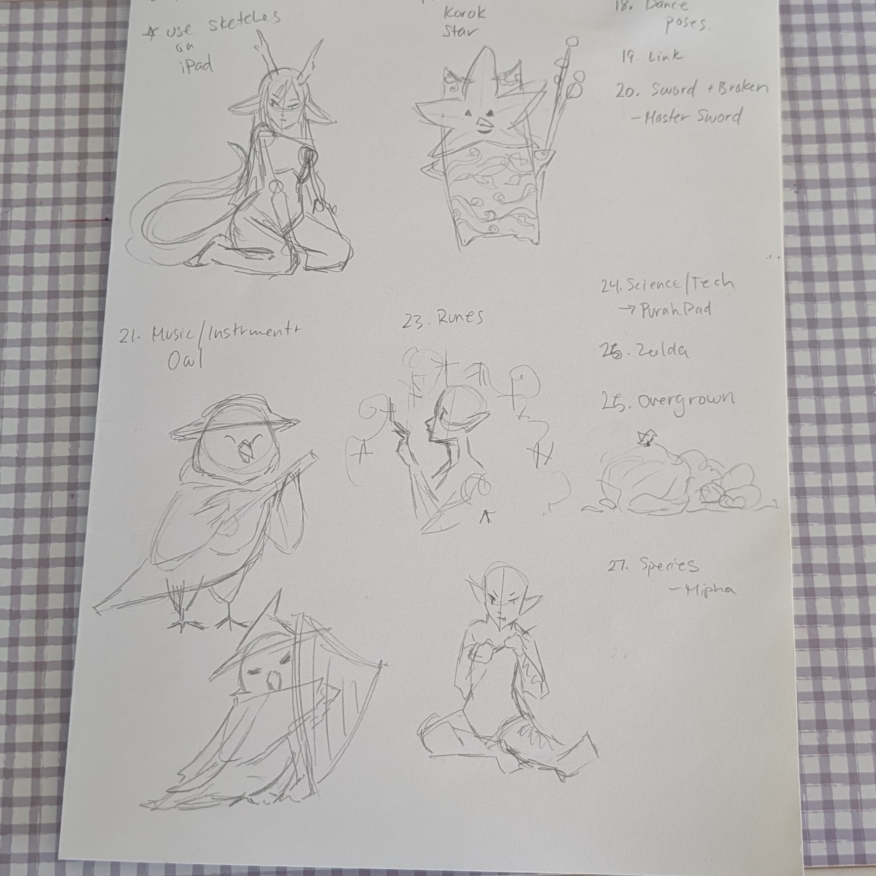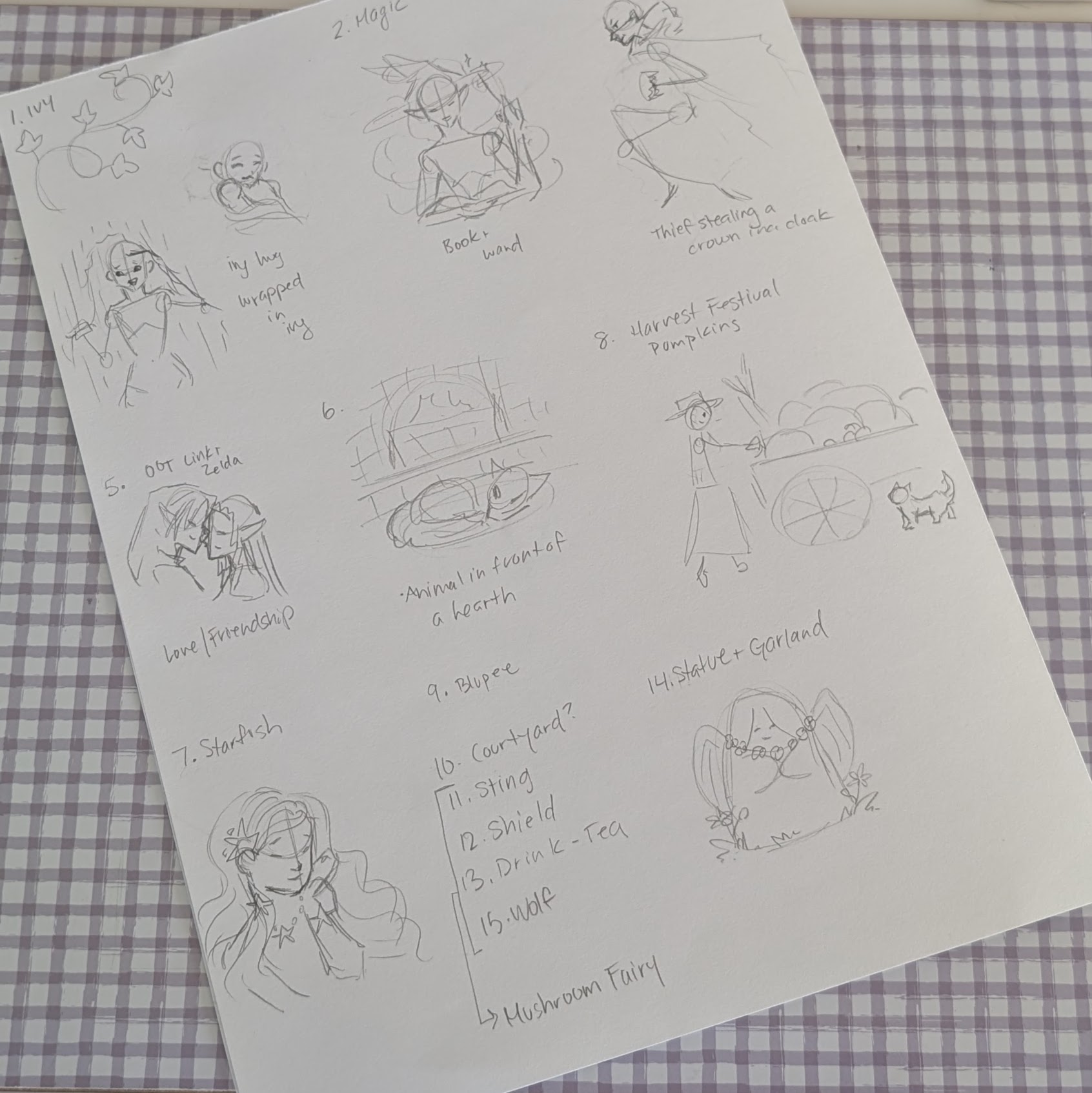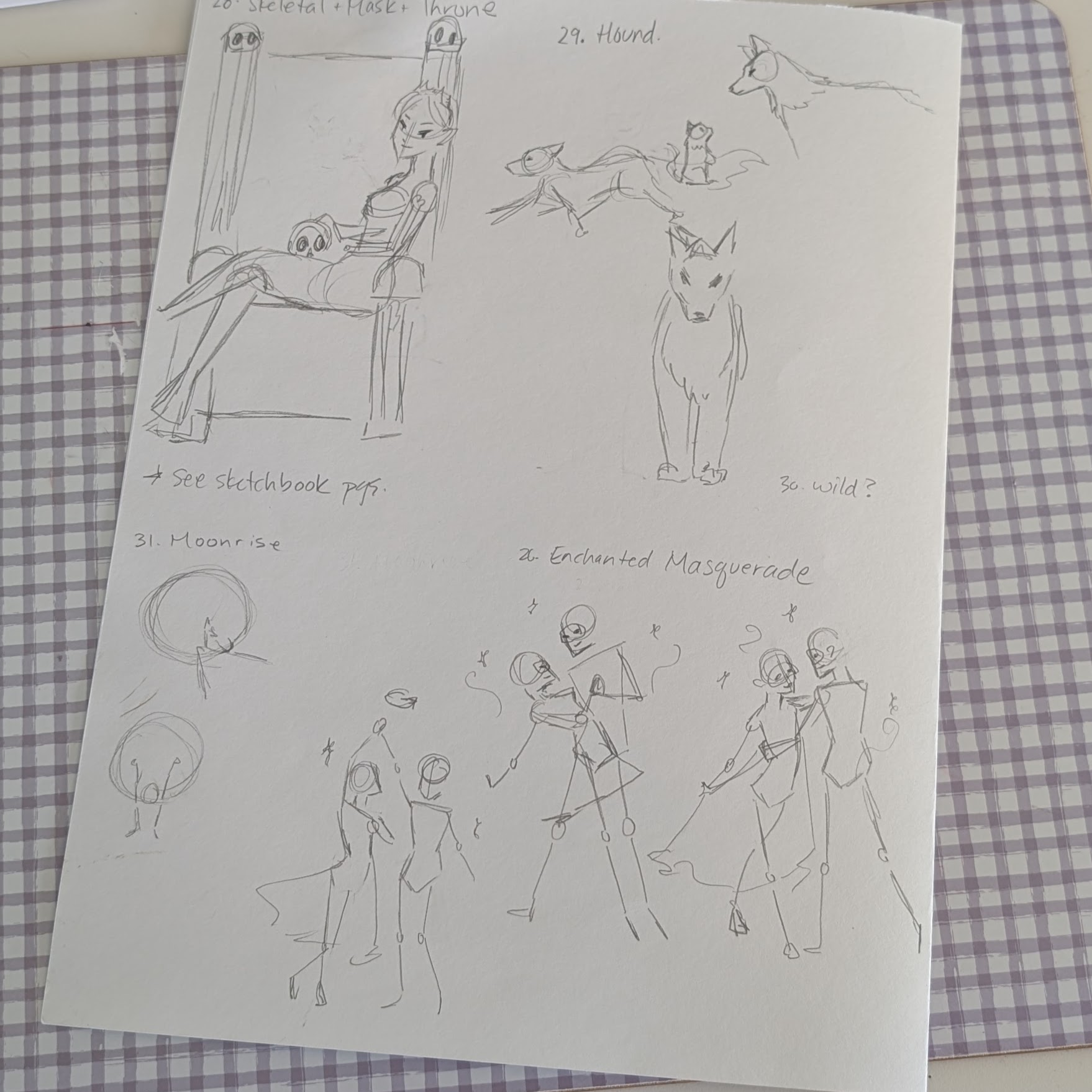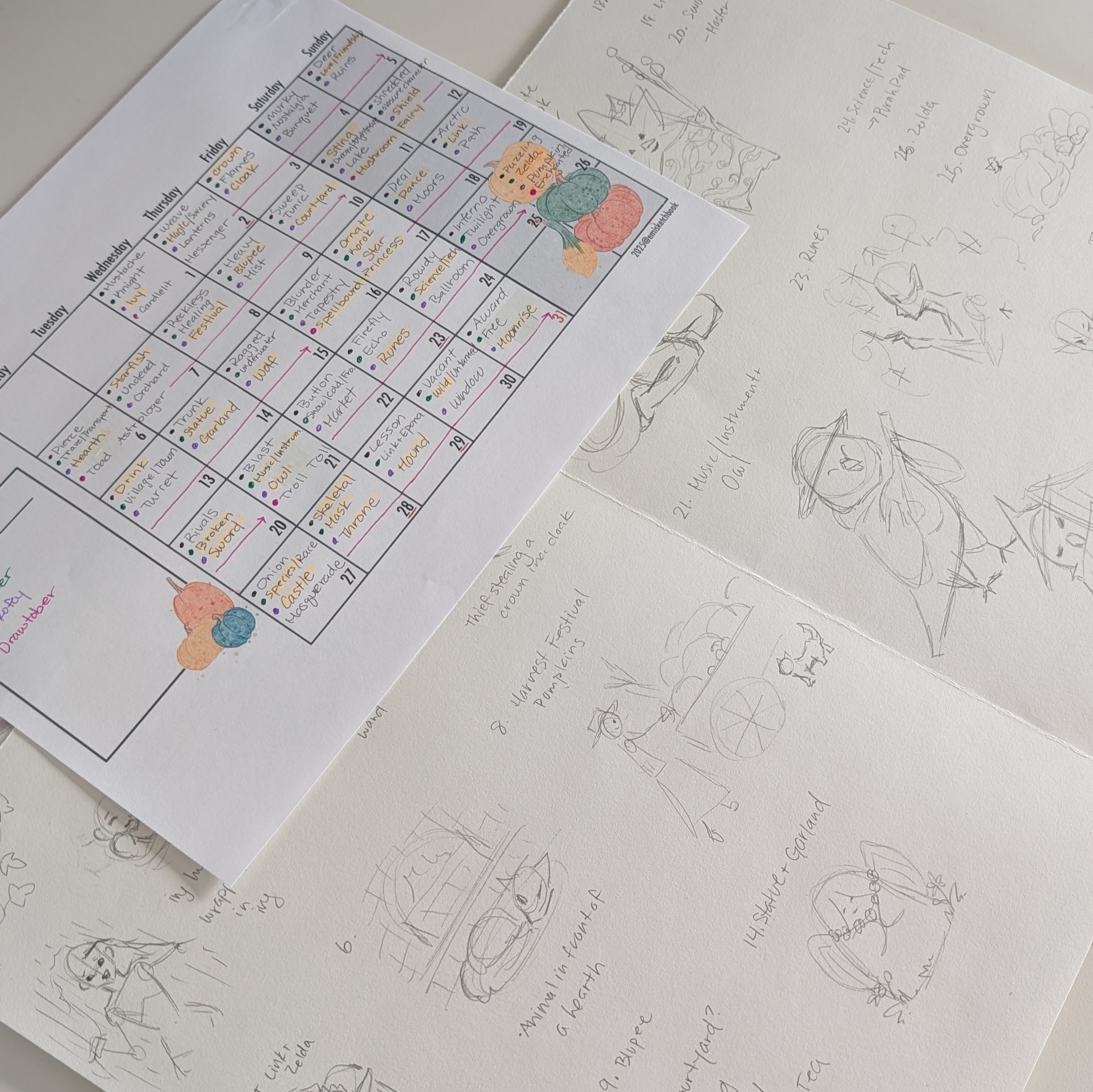 After setting up the the calendar, I picked my prompts and spent a day doing sketches. Coming up with the ideas is the most tedious part of the process, so doing this helped to take away the anxiety and pressure of doing it everyday, so I could focus on the art part for the rest of the month.
